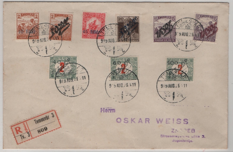 Rumänien, 1925, 307 Filler (Ung.- Überdruckmarken) MiF auf R.- Auslandsbrief von Temesvar nach Zagreb (Jug.9