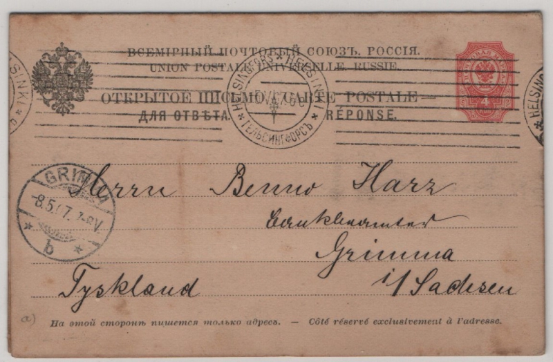 Russ. Reich / Finnland, 1907, 4 Kp.- Antwort- GS- Karte, als Auslandskarte gelaufen von Helsinki nach Helsinki + Helsinki nach Grimma