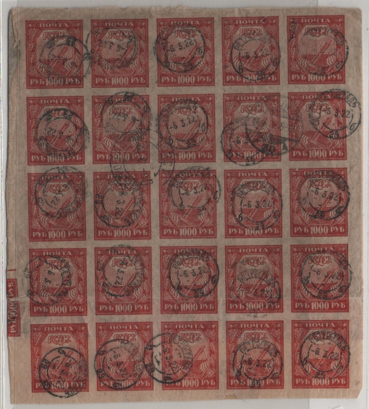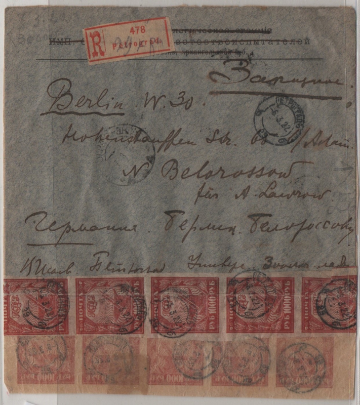 UDSSR, 1922, 1000 R. (30x, vs. + rs.) als MeF auf R.- Auslandsbrief von Petrograd nach Berlin