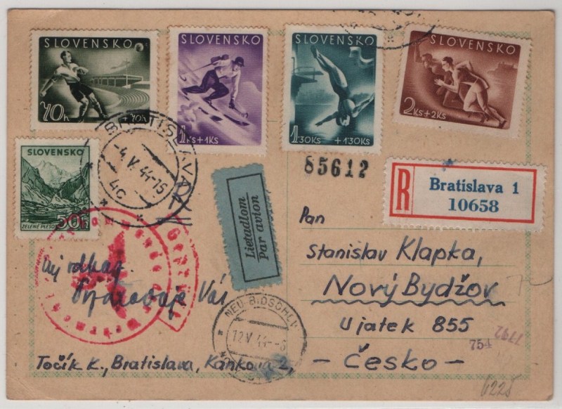 Slovakei, 1944, 5,5K. MiF auf Lupo- R- Inlandspostkarte, von Bratislava nach Novy Bydzov mit dt. Zensur