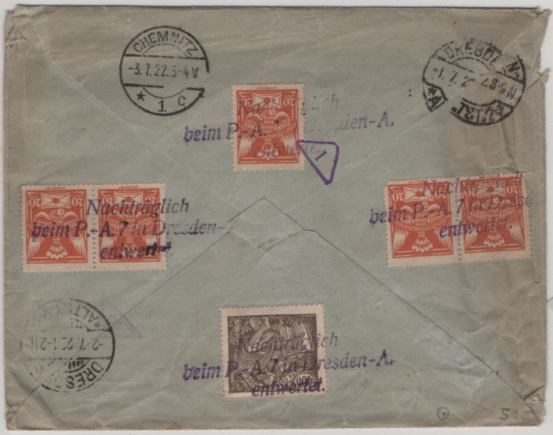 Rs. mit Transit- und Ankunftsstempel, Bedarfserhaltung; Umschlag hat Transport- und Lagerungsspuren, rs. nachträglich entwertet (Dresden!)