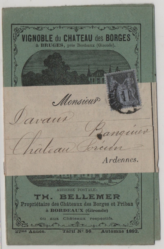 Frankreich, ca. 1900, 1 Ct. als EF auf Streifband mit Weinwerbung, als Ferndrucksache von Borges nach Chateau Porcien (F)