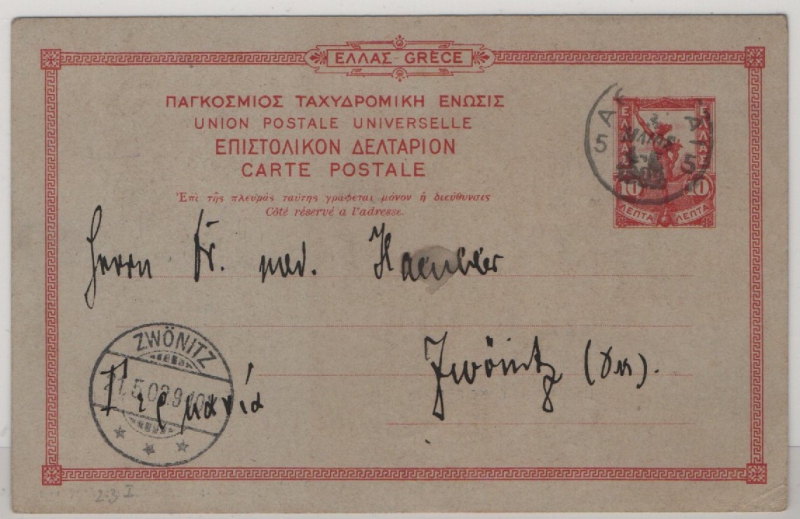 Griechenland, 1903 (?), 10 D. (?)- GS- Bildpostkarte (Königl. Fam.), gelaufen als Auslandspostkarte von A...ai nach Zwönitz