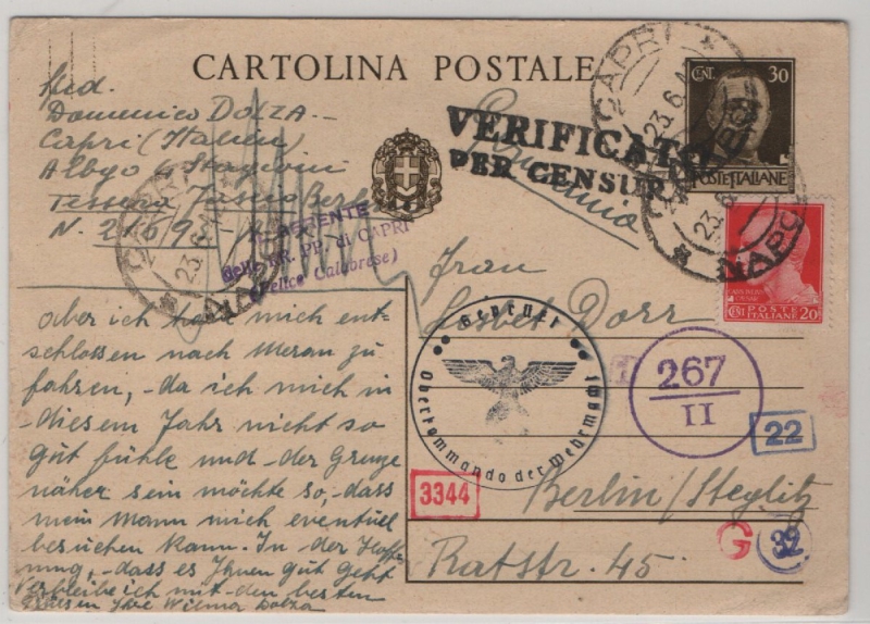 Italien, 1942, 30 Ct. GS- Karte + 20 Ct. Zusatzfrankatur als Auslandspostkarte von Capri nach Berlin, mit 7x Zensur!