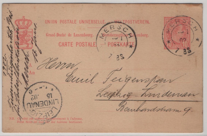 Luxemburg, 1902, 10 Ct.- GS, gelaufen als Auslandspostkarte von Mersch nach Leipzig