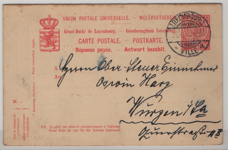 Luxemburg, 1913, 10 Ct.- Anwort- GS, gelaufen von Luxembourg nach Zwönitz