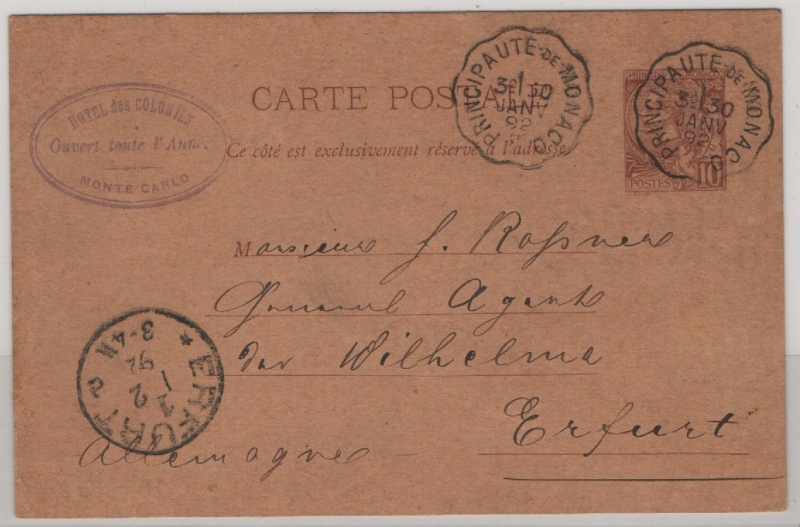 Monaco, 1892, 10 Ct. (?)- GS- Karte, gelaufen als Auslandskarte, von Monte Carlo nach Erfurt (D.)
