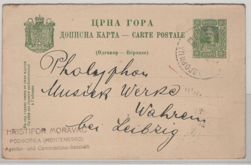 Montenegro, 1910 (?), 5 P. Antwort- GS- Karte (A.- Teil), gelaufen als Auslandskarte von Podgoriza nach Wahrem (? / D.)