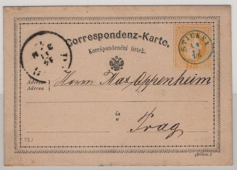 Österreich, 1875, 2 Kr.- GS- Karte (Böhm.), gelaufen von Stiekna (Schöner Stempel!) nach Prag