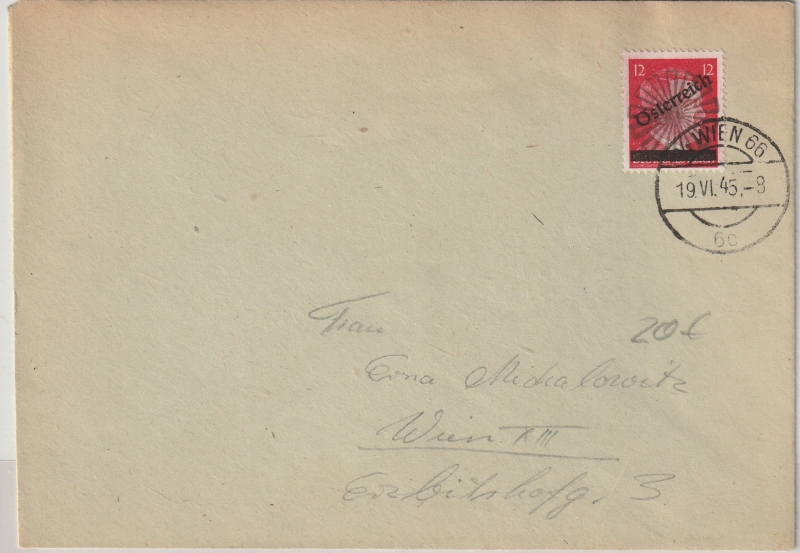 Österreich, 1945, 12 Rpf. AH- Überdruck- Ausgabe als reine EF auf Ortsbrief innerhalb Wien´s, Sehr selten!