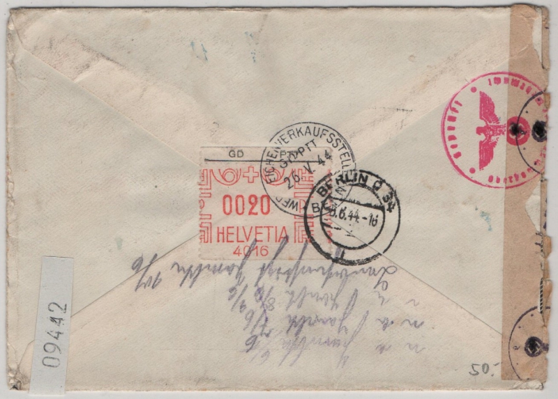 Schweiz, 1944, 1 Fr. MiF (vs. + rs. [mit Automatenmarke!?]) auf Auslands- Einschreiben von Bern nach Berlin + Zensur