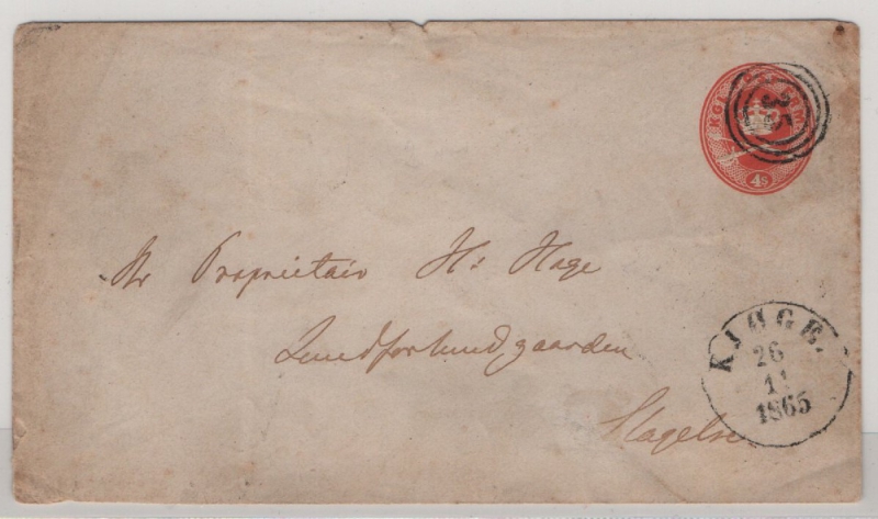 Dänemark, 1865, 4 S. GS- Umschlag gelaufen als Fernbrief von Kjöge (?) nach Slagelse