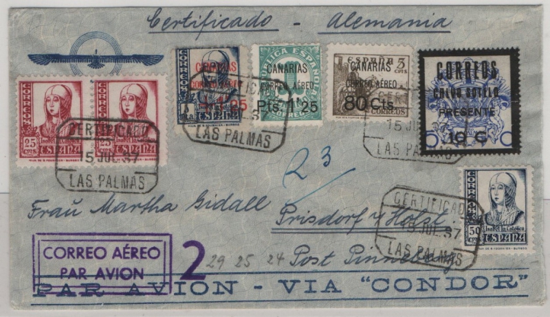 Spanien, Canarische Inseln, 1937, Canarias- Überdruck u.a. in MiF auf Luftpost- Auslandsbrief von Las Palmas nach Prisdorf