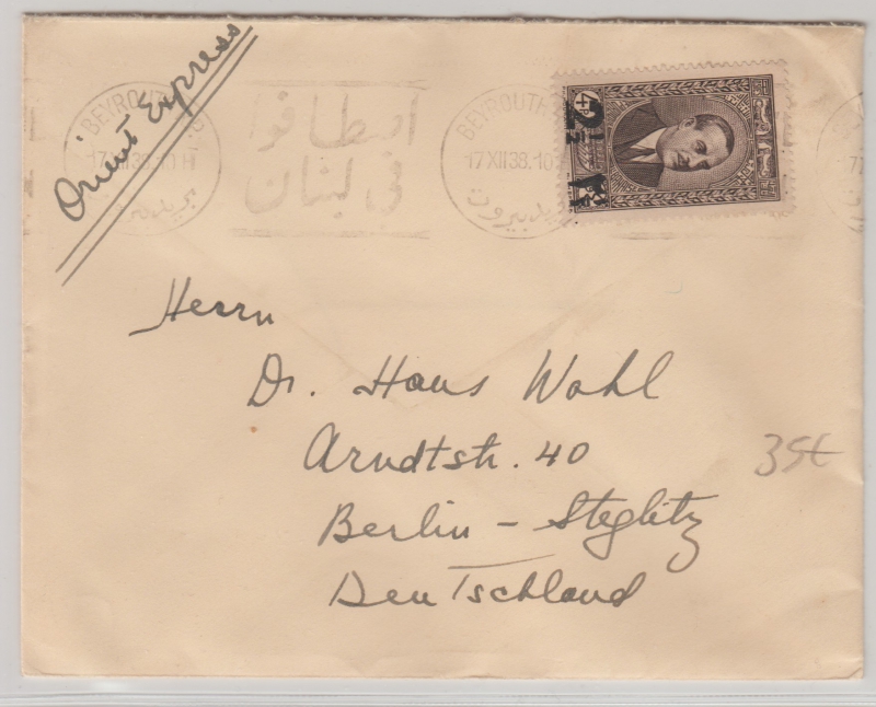 Libanon, 1938, 2 1/2- ... Überdruck Marke als EF auf Auslandsbrief von Beyrouth nach Berlin