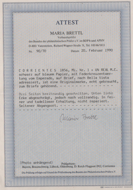 Argentinen, Corrientes, 1856, Mi.- Nr.: 1 als EF auf Fernbrief von Emperodo nach Bella Vista! FA Brettl BPP:"e+e"! RR!
