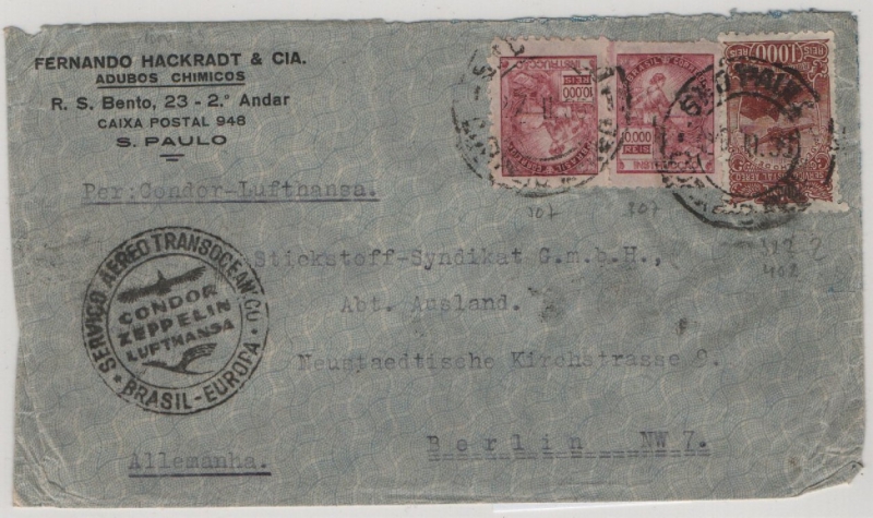 Brasilien, 1935, 21.000 Reis MiF auf Luftpost- Auslandsbrief von Sao Paulo nach Berlin