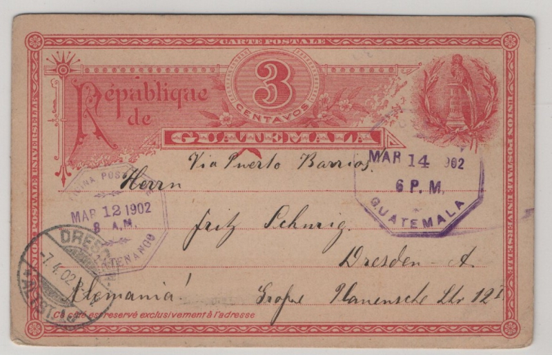 Guatemala, 1902, 3 Ct.- GS- Karte, gelaufen als Auslandspostkarte von Havenda Chloriola (?) via Hazmtepango nach Dresden