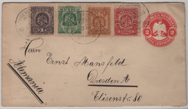 Mexiko, 1906, 2 Cent- GS- Umschlag + 10 Ct. Zusatzfr., als Auslandsbrief von Guadalupe Hidalgo nach Dresden