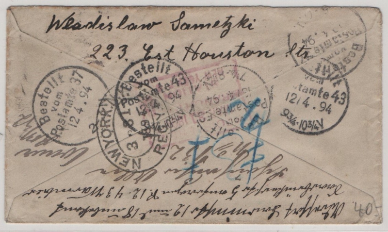 USA, 1894, 13 Ct. MiF auf R.- Auslandsbrief von New York nach Berlin, und hier mehrfache Zustellversuche + nachgesandt