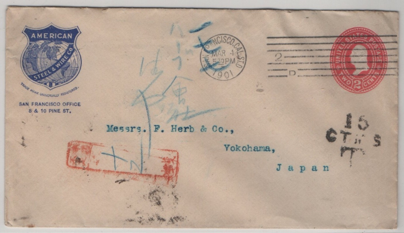 USA, 1901, 2 Ct.- GS- Umschlag + Nachportostempel (15 Ct.), als Auslansbrief von San Francisco nach Yokohama