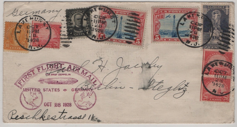 USA, 1928, 1,05 D. MiF(vs. + rs.) auf Zeppelin- Auslandsbrief (zum Erstflug USA- D.) von Lakehurst via Friedrichshafen nach Berlin