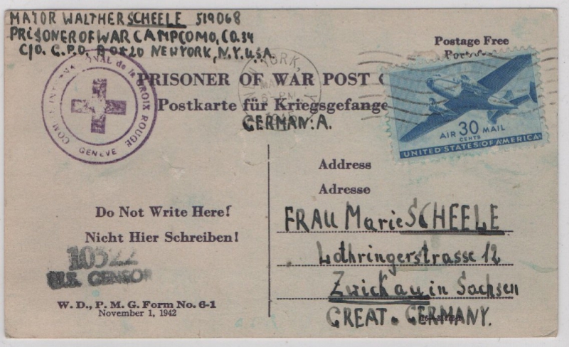 USA,  27.5.1945, 30 Ct. EF auf Kriegsgefangenen- Auslands- Postkarte von New York nach Zwickau, mit US- Zensur